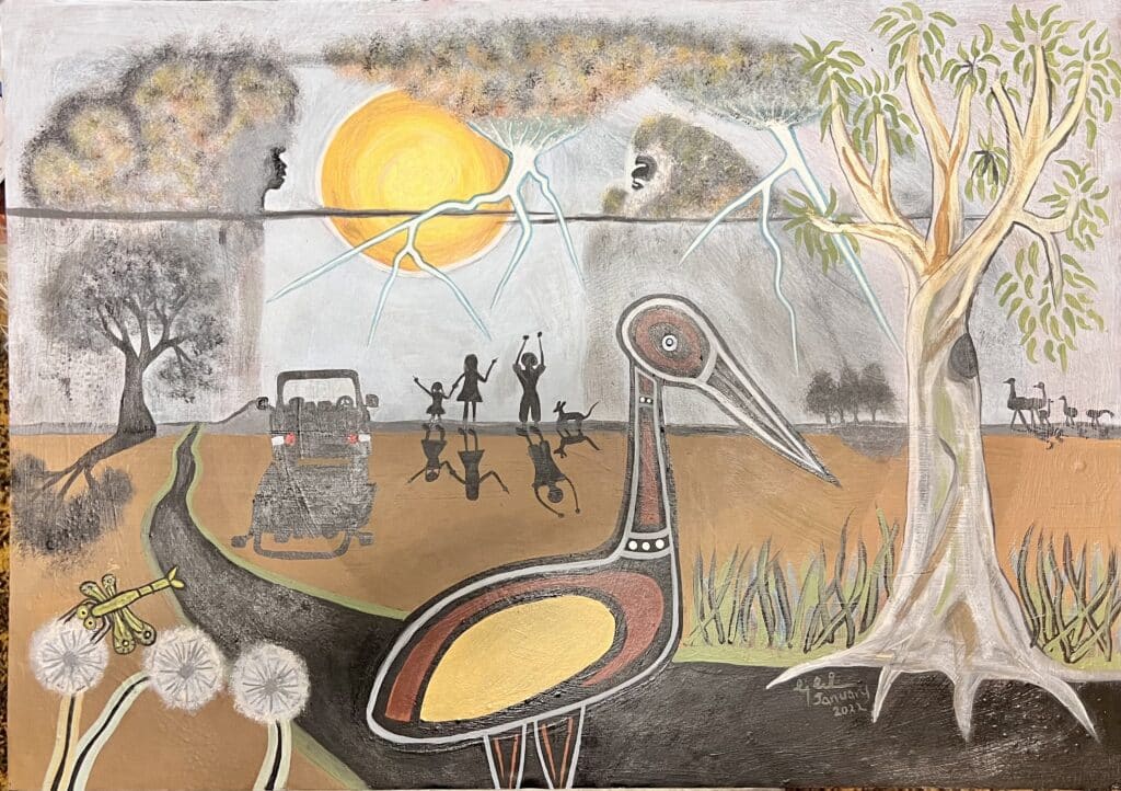 Craig describes his life journey and how he became himself, following his path, and not a path created by others. The painting depicts a canoe tree in the middle of nowhere, and although the tree looks dead, it tells a story that you have to look deeply to understand.